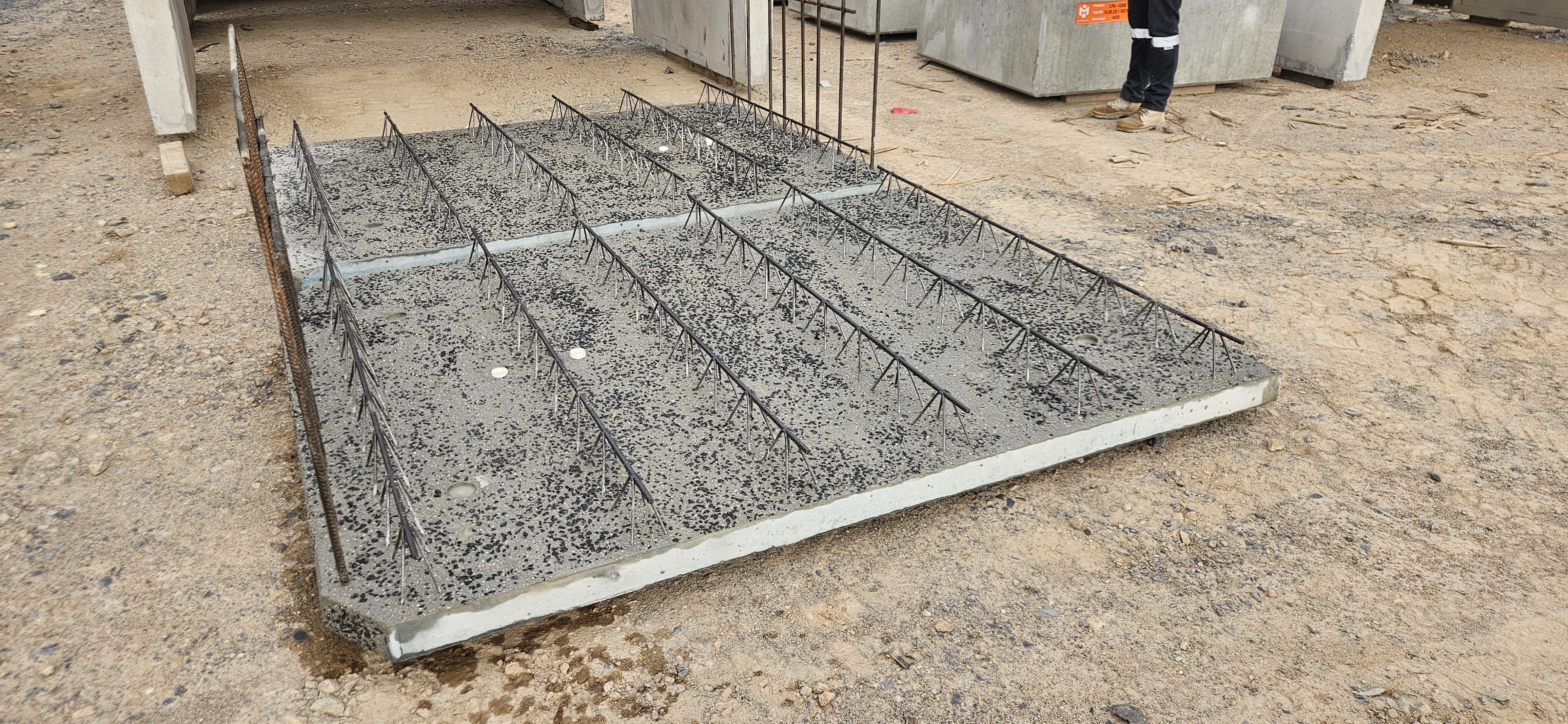 Once the concrete is cast, a retarder is applied to the panel’s upper surface. This retarder temporarily delays surface curing, enabling the top layer of concrete to be washed after the initial set. The result is a scabbled, textured finish that promotes effective mechanical bonding between the precast panel and the concrete topping during subsequent construction stages.